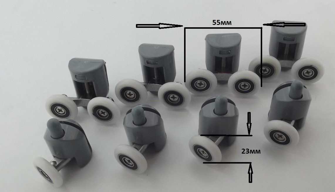 Универсальный комплект роликов для душевых кабин из 8шт в комплект входит 4 верхних ролика 4 нижних ролика. Верхние ролики двойные с регулировочным болтом нижние с нажимной кнопкой.